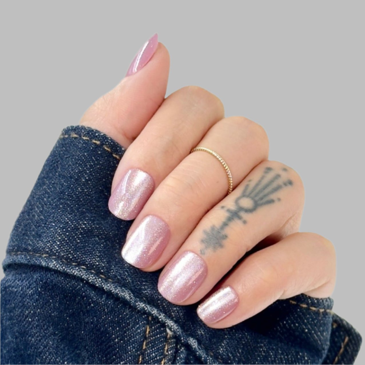 This nail design features a soft, dusty pink with a stunning glitter finish, perfect for a subtle yet glamorous look. 🌸✨ Paired with elegant gold accessories, it’s a chic and timeless style for any occasion! 💅💖