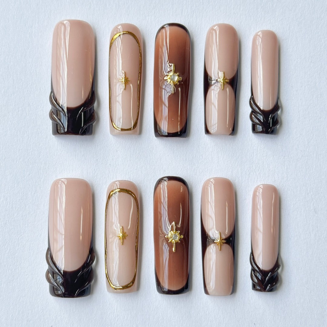 Each set has 10 pcs of Press-on nails and a Free application kit(Nail glue, Sticky tab, Nail file, and cuticle pusher). Within minutes- you'll have nails fit for a Queen!