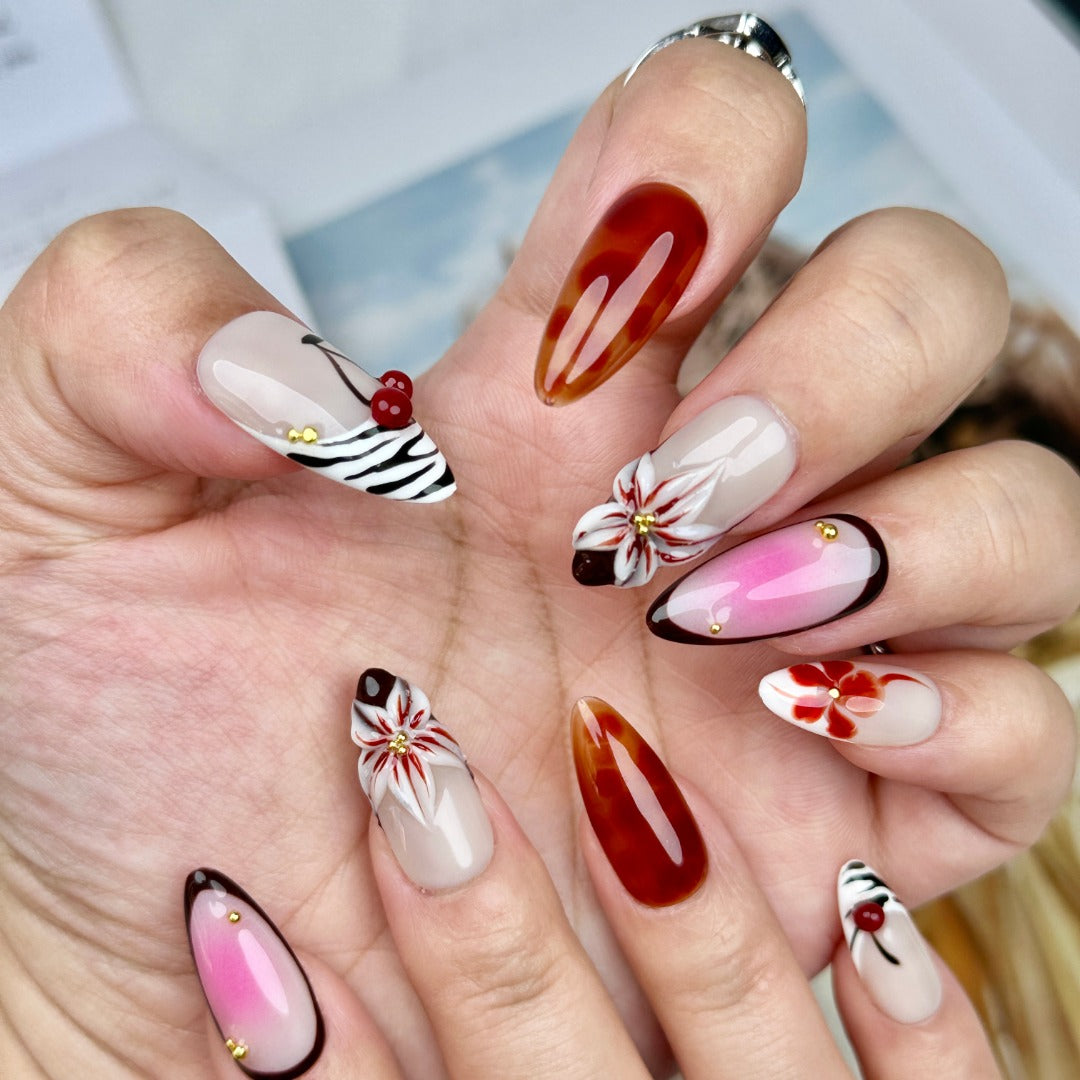 Each set has 10 pcs of Press-on nails and a Free application kit(Nail glue, Sticky tab, Nail file, and cuticle pusher). Within minutes- you'll have nails fit for a Queen!