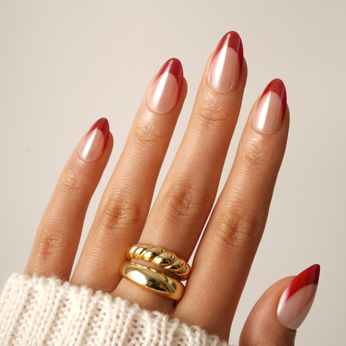 Get festive with our Scarlet Edge Nail Set! Featuring rich red French tips topped with a glossy glaze, this design is perfect for adding a touch of glam to your holiday style. The chic almond shape effortlessly elongates your fingers, giving you that sophisticated look from day to night.✨💅